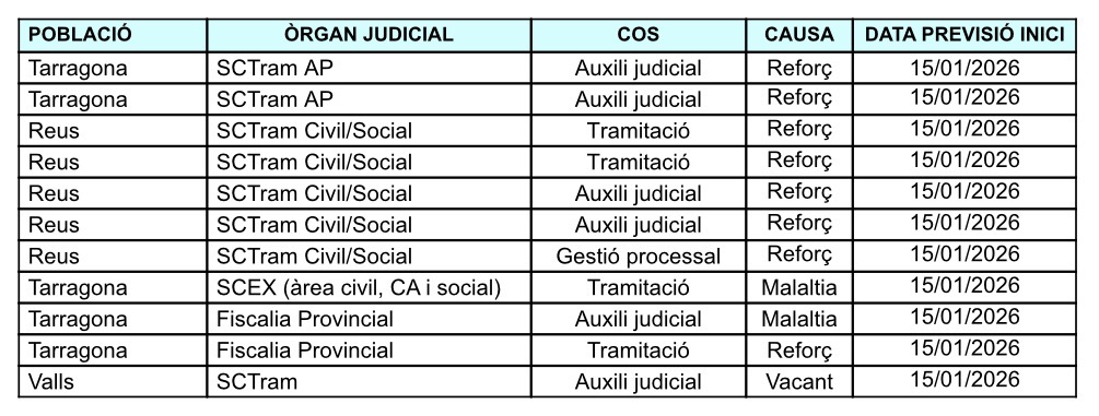 Tramitación Procesal:  una plaza vacante (con reserva) en el Juzgado de Instrucción 3 de Lleida y una plaza por sustitución paternidad en el Juzgado de lo Social 1 de Lleida.